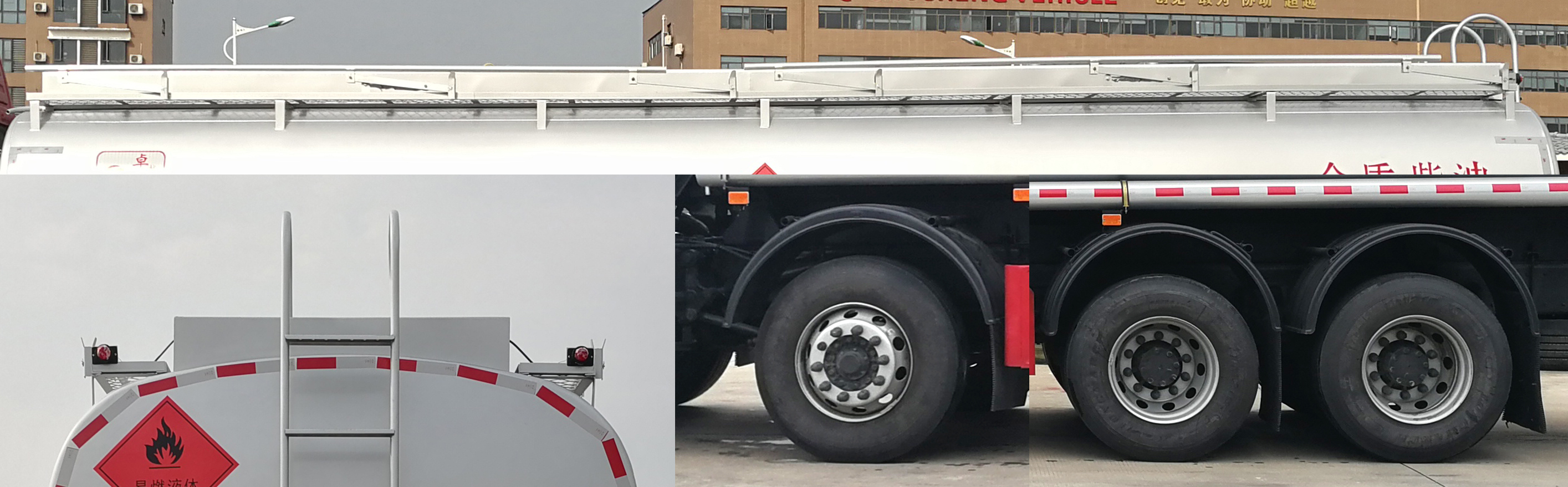 配置  該車為危險(xiǎn)貨物運(yùn)輸車,運(yùn)送危險(xiǎn)貨物車輛類型為:FL型,類項(xiàng)號(hào):3。運(yùn)輸介質(zhì):汽油,罐體有效容積27.5立方米,罐體外形尺寸(長(zhǎng)×寬×高)(mm):8900×2300×1660。僅選用軸距(mm):1800+4575+1400。側(cè)、后防護(hù)材料均為Q235,螺栓連接,后防護(hù)截面尺寸(mm)80×140,下邊緣離地高460mm。隨底盤選裝駕駛室。僅選用排氣管前置、限速裝置(限速80km/h)、前輪盤式制動(dòng)及子午線輪胎的底盤。轉(zhuǎn)向輪安裝輪胎爆胎應(yīng)急防護(hù)裝置。后軸采用空氣懸架。安裝帶有衛(wèi)星定位功能的行駛記錄儀。EBS**系統(tǒng)型號(hào)/生產(chǎn)廠家:EBS3/威伯科(上海)管理有限公司。發(fā)動(dòng)機(jī)/油耗值(L/100km)對(duì)應(yīng)關(guān)系為:MC07.31-60/38.0,MC07.34-60/38.0,MC09.35-60/38.2,MC09.38-60/38.2,MC09.35B-60/38.2,MC07.33-60/38.0,MC07H.33-60/37.44,MC07H.35-60/37.44,MC11.40-60/37.3,MC11.44-60/37.3,MC11.40-61/37.3,MC11.43-61/37.3,WP8.350E61/38.04。選裝ETC。罐體上部選裝上走道,**軸及驅(qū)動(dòng)軸選裝弧形擋泥板。