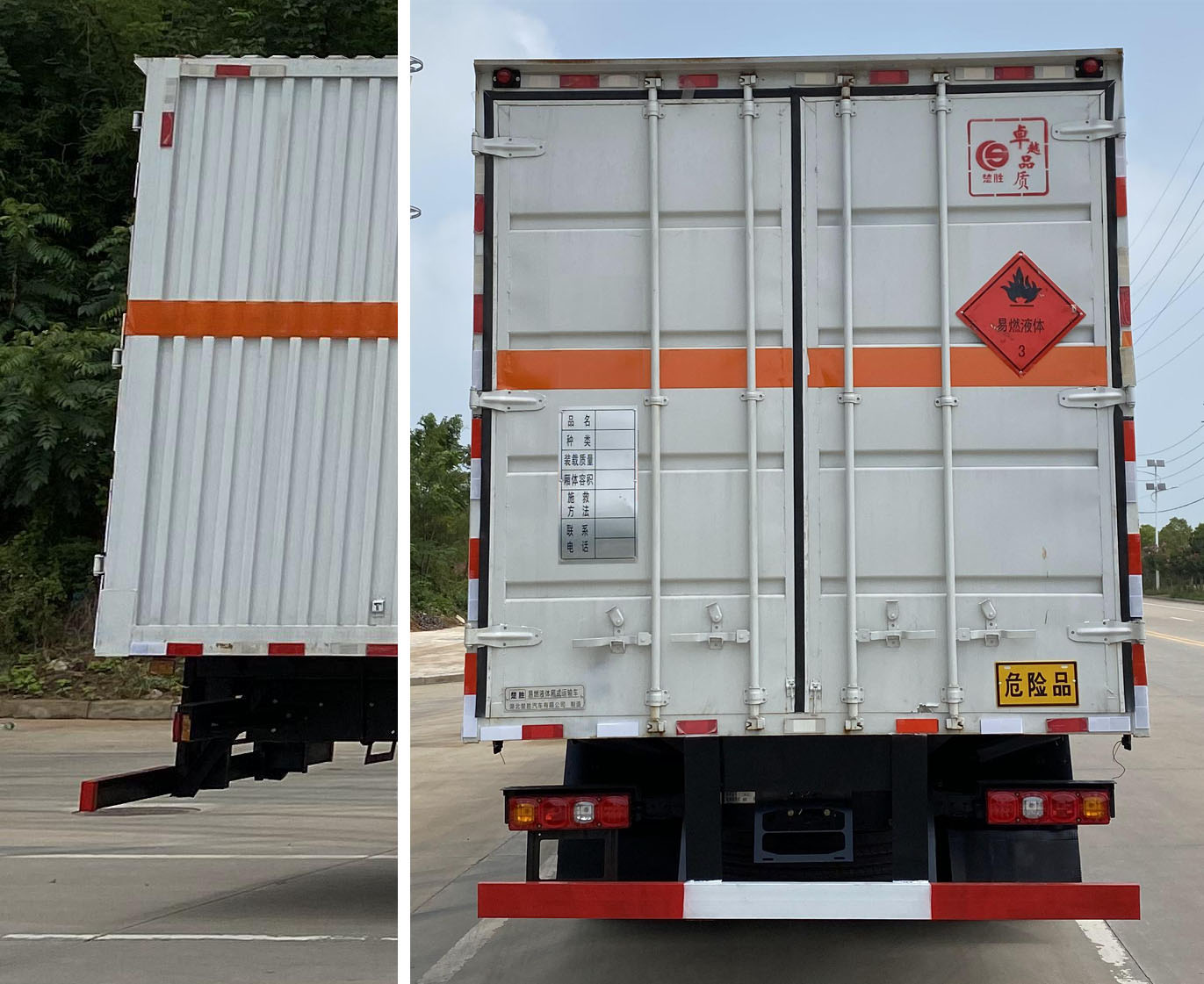 | 配置 | 1、該車適用于危險品運輸,類項號:3。2、側、后防護材料均為Q235,側防護螺栓連接;后防護焊接,截面尺寸(寬×高)(mm)60×120,下邊緣離地高480mm。3、僅采用軸距(mm): 1800+4575+1400。EBS系統(tǒng)生產(chǎn)廠家及型號為:威伯科汽車**系統(tǒng)(**)有限公司(EBS3),廣州瑞立科密汽車電子股份有限公司(CM-EBS)。僅選用排氣管前置、限速裝置(限速79km/h)、前輪盤式制動及子午線輪胎的底盤;安裝帶有衛(wèi)星定位功能的行駛記錄儀;發(fā)動機型號及油耗值(L/100km)為:WP7.270E61/37.47,WP7.300E61/37.47,WP8.320E61/38.07,WP8.350E61/38.07。后軸采用空氣懸架。轉向輪安裝輪胎爆胎應急防護裝置。尾板收起狀態(tài)水平長度為290mm,尾板質(zhì)量為550kg。該車型可選裝ETC車載裝置.選裝后部無尾板;選裝側門型式及位置,選裝側門數(shù)量,選裝不開側門,廂體側面板選裝開百葉窗,選裝瓦楞板結構。廂體頂部封閉不可開啟。運輸具有**容器(瓶)包裝的物品。 | ||