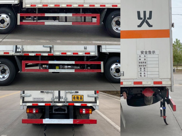 1、該車為危險品運輸車.運輸具有獨立容器(瓶)包裝的易燃液體物品.運送危險物品類項號:3類.廂體頂部封閉不可開啟.2、側(cè),后防護材料均為Q235,側(cè)防護螺栓連接,后防護焊接,截面尺寸(mm):100×50,下邊緣離地高430mm.3、整備質(zhì)量含備胎,滅火器及隨車工具;貨廂重量為1090kg;材質(zhì)/厚度:復(fù)合板結(jié)構(gòu)廂體:底板材質(zhì)為Q235,厚度3mm,側(cè)板為外Q235+中間阻燃泡沫+內(nèi)純鋁板,厚度42mm;瓦楞板結(jié)構(gòu)廂體:底板材質(zhì)為Q235,厚度3mm,側(cè)板為Q235,厚度1.5mm.4、僅選用排氣管前置、限速裝置(限速80km/h)、前輪盤式制動及子午線輪胎的底盤,轉(zhuǎn)向輪安裝輪胎爆胎應(yīng)急防護裝置,安裝具有衛(wèi)星定位功能的行駛記錄儀.ABS系統(tǒng)控制器型號/生產(chǎn)企業(yè): APG3550500A/浙江亞太機電股份有限公司,3550B500/浙江亞太機電股份有限公司,VIE ABS-II/浙江萬安科技股份有限公司.發(fā)動機/油耗值(L/100km)對應(yīng)關(guān)系為:JX493ZLQ6D/10.75,JX4D25A6H/10.83.隨底盤選裝駕駛室,選裝白色中網(wǎng),選裝白色前保,選裝黑色前保,選裝廂體側(cè)面選裝開門型式及位置,選裝不帶側(cè)開門,選裝貨廂平面或瓦楞結(jié)構(gòu);廂體側(cè)面選裝開百葉窗,選裝后部樣式,該車可選裝直接供電式ETC車載裝置.